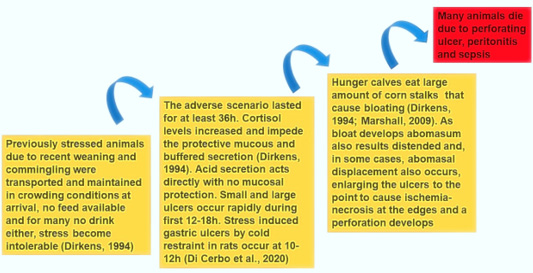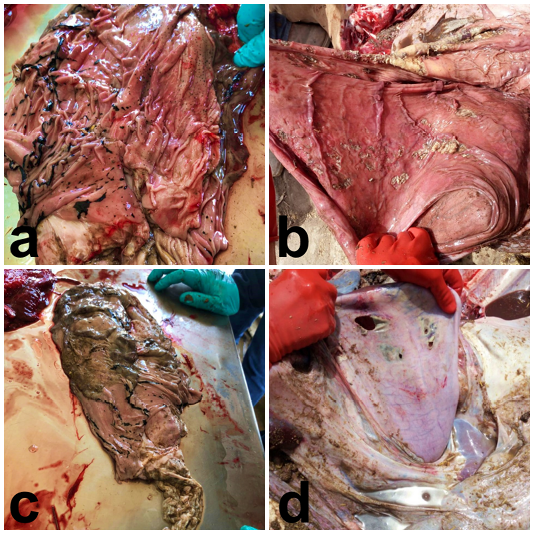 Calves, abomasa, different degrees of lesion severity. (a) several ulcers in fundus are evident, some lineal on the folia and other irregulars with blood clots on the surface. Microscopically, few were transmural and reached the serosa provoking focal peritonitis but not rupture. These lesions could be included as grade 2 (Marshall, 2009). (b), other ulcers were covered by fibrinous exudate (diphtheric plaque); histologically these lesions reached muscular layer wall but not the serosa (grade 1). (c) In some cases, the grade 2 ulcerative abomasitis included a profuse haemorrhage forming large blood clots within the abomasum. In this case the clot is on the upper left corner. (d) In some necropsies the abomasal content was spread throughout the peritoneal cavity leading to mild and diffuse fibrinous inflammation within the abdominal cavity (grade 4; focal peritonitis is included as grade 3). In all cases mild to severe bronchopneumonia was recognized (grossly and microscopically), except in most cases of grade 4, abomasal perforating ulcers, in which bronchopneumonia lesions were inconclusive, because limited extension (≤ 30%).