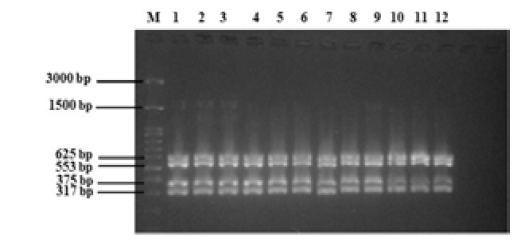 Multiplex PCR standardization E. coli O157:H7 with four target genes (eae, 375 bp; fliC, 625 bp; rfbE, 317 bp; stx2A, 553 bp). M = 100 bp DNA marker, 1 to 12 = annealing temperatures 50 to 61°C.