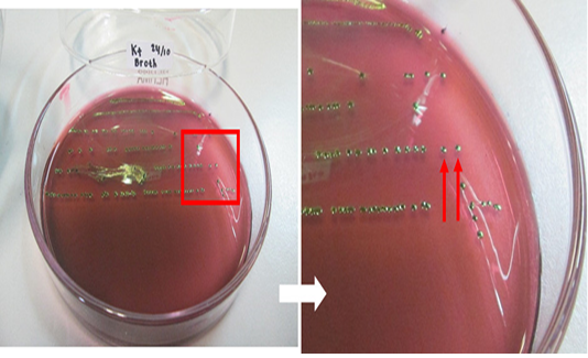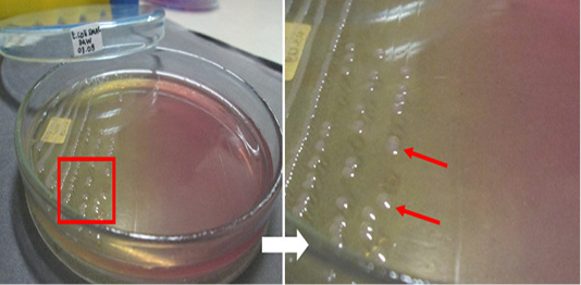 Escherichia coli O157-positive control isolate culture on SMAC medium. The red arrow indicates the colonies.
