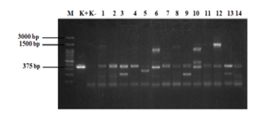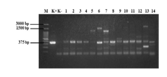 PCR results of samples. M = 100 bp DNA marker, K+ = positive control, K- = negative control, 1 = D1, 2 = D2, 3 = KR9, 4 = B6, 5 =B4, 6 =B3, 7 =B2, 8 = B7-2, 9 =B12-2, 10= B8-3, 11 = B14-3, 12 = B3-3, 13 = B12-3, and 14 = B16-2. Annealing temperature, 53 °C.