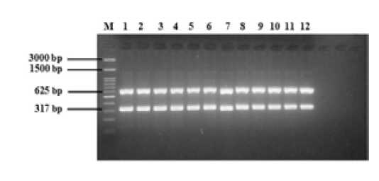 Multiplex PCR optimization of E. coli O157:H7 with two target genes (fliC, 625 bp; rfbE, 317 bp). M = 100 bp DNA marker, 1 to 12 = annealing temperatures 50 to 61°C.
