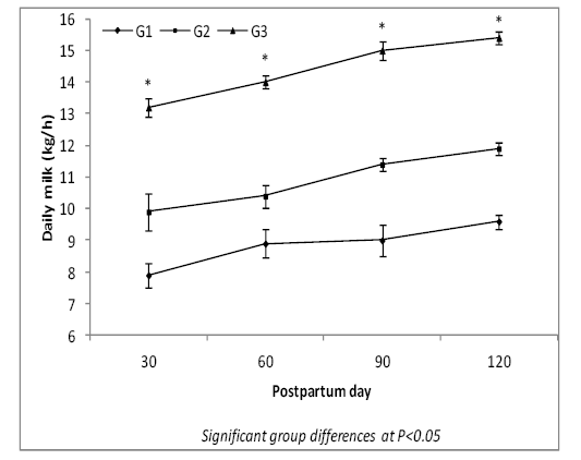 Average of daily milk yield of cows in experimental groups during four lactation months.