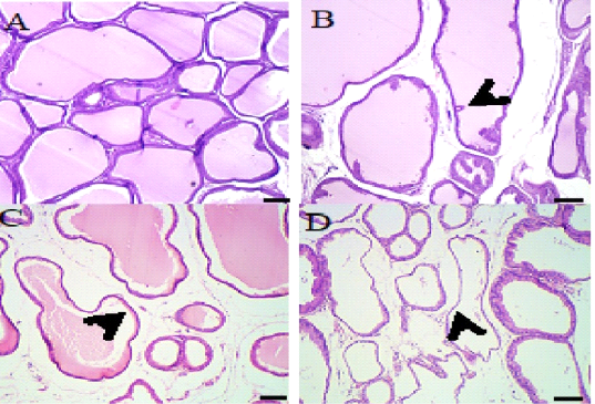 A: Photo micro graph of male rat Prostate gland (control) showing normal prostatic acini with secretion, the acini, interstitium and muscles were normal (H&E; x100). B: Photo micro graph of male rat prostate gland showing normal prostatic acini (arrows) and interstitial edema, the majority of prostatic acini contained secretion and normal beside interstitial edema (H&E; x100). C: Photo micro graph of male rat prostate gland showing slightly cystic acini with little secretion (arrows), mild dilated acini contained little secretion beside edema and congested blood vessels in interstitium (H&E; x100). D: Photo micro graph of male rat prostate gland showing cystic acini without secretion (arrows) and interstitial edema, Cystic glandular acini devoid from their secretion and interstitial edema were common, other acini lined by hyperplastic epithelium (H&E; x100).