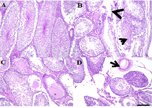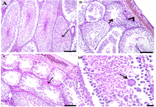 A: Photo micro graph of male rats (control) showing normal seminiferous tubules and active spermatogenesis, seminiferous tubules, interstitium and covering were within normal morphological picture (H&E; x100). B: Photo micro graph of male rat testis showing necrotic seminiferous tubules containing edema and necrotic debris (arrow) and interstitial edema (arrowhead), some seminiferous tubules were necrotic and contained edema and necrotic debris beside interstitial edema, A few tubules had pyknotic spermatogonia and spermatocytes with intense congestion and edema in the interstitium (H&E; x100). C: Photo micro graph of male rat showing intense edema and necrosis of the seminiferous tubules and arrest of spermatogenesis (arrows), the majority of tubules showed arrest of spermatogenesis with intense necrosis and edema inside their lumina severe edema and congested blood vessels in capsule and interstitium (H&E; x100). D: Photo micro graph of male rat testis showing spindle cell invasion for necrotic seminiferous tubules (arrows) and interstitial edema, the majority of necrotic acini invaded by spindle cells with mononuclear cells infiltration beside interstitial edema , other tubules collapsed with loss of thus lining epithelium and contained necrotic debris and threads. Dilated blood vessels with prominent edema in interstitium (arrow) (H&E; x100).