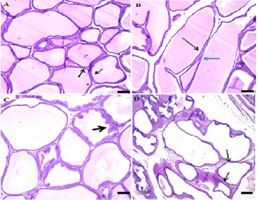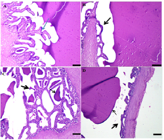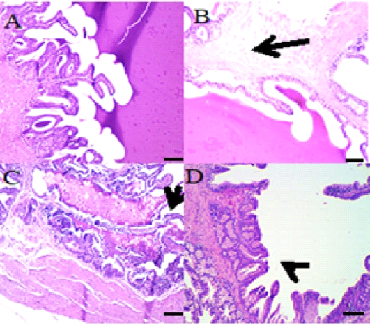 A: Photo micro graph of male rat seminal vesicle (control) showing normal tubuloalveolar glands and secretion, glandular structure, Trabeculae and covering tunica were normal (H&E; x100) . B: Photo micro graph of male rat Seminal vesicle showing normal tubule alveolar glands and edema in the smooth muscles, all the glandular structure appeared normal while tunica muscularis were edematous arrows (H&E; x100). C: Photo micro graph of male rat seminal vesicle showing partial desquamation of some glandular epithelium (arrows) and foamy secretion, some glands had partially desquamated epithelium and filled with foamy esinophilic colloidal secretion (H&E; x100). D: Photo micro graph of male rat seminal vesicle showing hyperplastic glands without secretion (arrows), tubuloalveolar glands were either hype plastic without secretion. Tunica muscularis had partial edema or necrosis (H&E; x100).