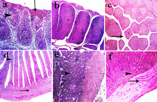 Photomicrographs of H&E stained bursa of fabricius and intestine sections of the chickens. Bursa of fabricius of group-1 shows mild depletion of lymphocytes (head arrow), interfollicular fibroplasia and focal hemorrhage (arrow) (a, 400x). Bursa of fabricius of group-2 shows apparently normal lymphoid follicles (b, 200x). Bursa of fabricius of group-3 shows mild interfollicular edema (arrow) (c, 200x). Intestine of group-1 shows degenerated submucosal glands (arrow) and fusion of villous tips (head arrow) (d, 400x). Intestine of group-2 shows hyperplastic intestinal glands in submucosa (head arrow) (e, 400x). Intestine of group-2 shows hyaline degeneration of muscular layer (arrow) and proliferative submucosal glands (f, 400x)