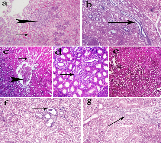 Photomicrographs of H&E stained kidney sections of the chickens. The kidneys of group-1 shows intertubular extravasated RBCS (arrow) with focal necrosis replaced by leukocytes cells (head arrow) (a, 200x), and urate deposition (arrow) within renal tubules (b, 400x). The kidneys of group-2 shows mild tubular degeneration (arrow) and congestion of the renal tubules (head arrow) (c, 200x), nephrotic changes in some renal tubules (arrow) (d, 400x), and few extravasated erythrocytes among dissociated renal tubule (e, 200x). The kidneys of group-3 shows dilatation of some renal tubules containing casts (arrow) (f, 400x) and regeneration of some renal tubules (arrow) (g, 400x).