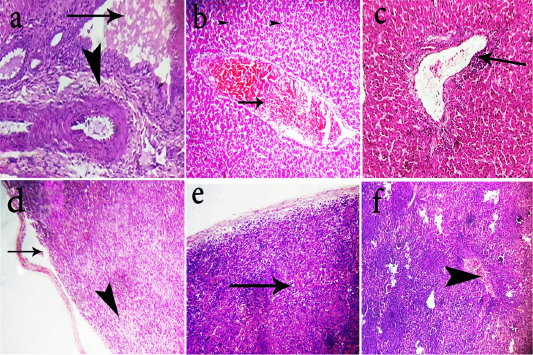Photomicrographs of H&E stained liver and spleen sections of the chickens. Livers of group-1 shows portal fibrosis (head arrow) and cholestasis(arrow)(a, 400x). Livers of group-2 shows moderate congestion of the hepatic blood vessels (arrow) (b, 200x). Livers group-3 shows mild perivascular lymphocytic cells infiltration of (arrow) (c, 200x). Spleen of group-1 shows lymphoid depletion (head arrow) and splitting of capsule (arrow) (d, 400x). Spleen of group-2 shows subcapsular edema and mild depletion (arrow) (e, 200x). Spleen of group-3 shows congestion of blood vessels (arrow head) with hyperplastic white pulps (f, 200x).