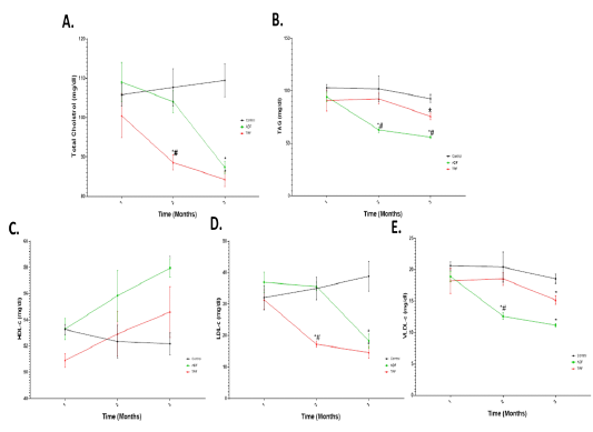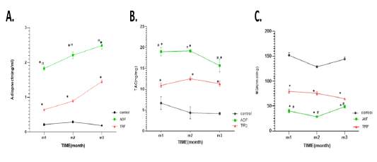 Total cholesterol (TC), Triacylglycerol (TAG), HDL-c, LDL-c and VLDL-c (mg ΜΈ dl) in different fasting protocols (ADF or TRF) for 3 months. Values are mean ± SEM. * P < 0.05 vs control. # P < 0.05 vs ADF.