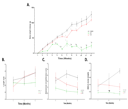 Body weight change and anthropometric measurements in different fasting protocols (ADF or TRF) for 3 months. Values are mean ± SEM. * P < 0.05 vs control. # P < 0.05 vs TRF.