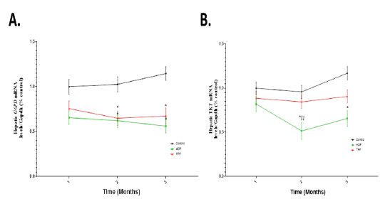 Hepatic mRNA expression levels of G6PD and TKT in different fasting protocols (ADF or TRF) for 3 months. Values are mean ± SEM. * P < 0.05 vs control. # P < 0.05 vs ADF.