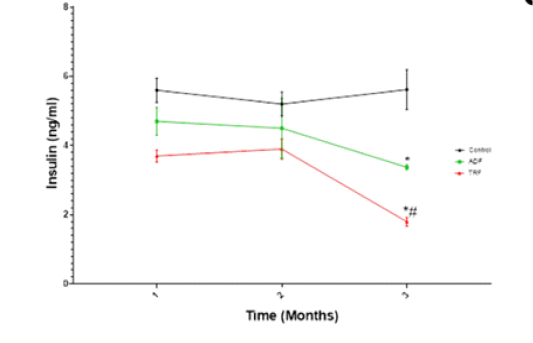 Serum insulin (ng/ml) level in different fasting protocols (ADF or TRF) for 3 months. Values are mean ± SEM. * P < 0.05 vs control. # P < 0.05 vs TRF.