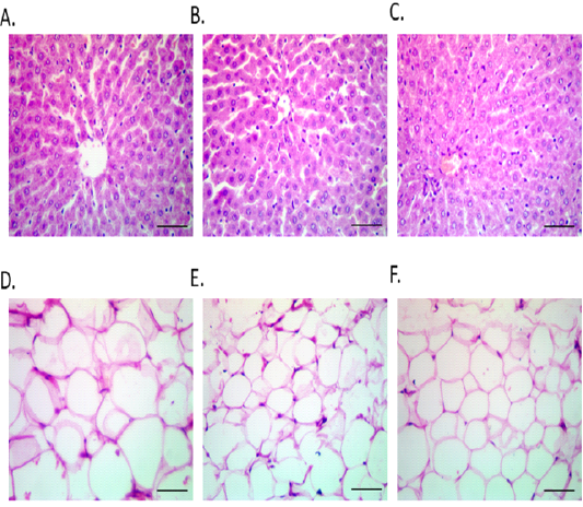 Hepatic and S/C WAT photomicrographs in different fasting protocols (ADF or TRF) for 3 months. Hepatic histological architecture of CON (Fig. 6 A), ADF (Fig. 6 B) and TRF (Fig. 6 C) groups. Subcutaneous white adipose tissue had largest diameter in CON (mean diameter=81.31mm) (Fig. 6 D), than ADF (mean diameter=30.6mm) (Fig. 6 E) and TRF groups (mean diameter=51.85mm) (Fig. 6 F).