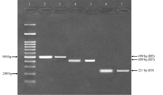 RT-PCR for confirmation of avian influenza H5, H7 and H9 viruses. Lane 1 = 100bp DNA marker (Fermentas, USA), lane 2 and 3= An expected PCR product size 499 bp was detected positive for influenza (H5), lane 4 and 5 = An expected PCR product size 409 bp positive for influenza (H7) and lane 6 and 7 = An expected PCR product size 221 bp positive for influenza (H9).