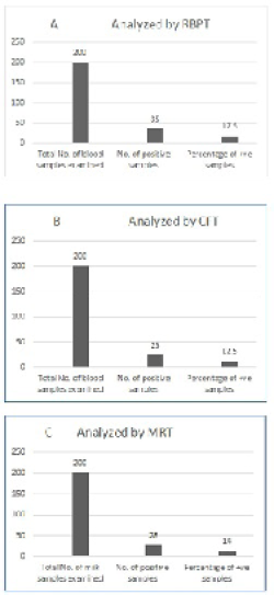 Figure 1: Prevalence of bovine brucellosis in Karachi: A. Analysed by RBPT; B. Analysed by CFT; C. Analysed by MRT
