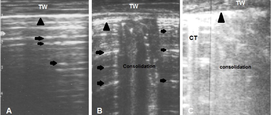 (C) Diffuse area of consolidation and comet tail (CT) artifact reflect presence of severe disease. TW: Thoracic wall