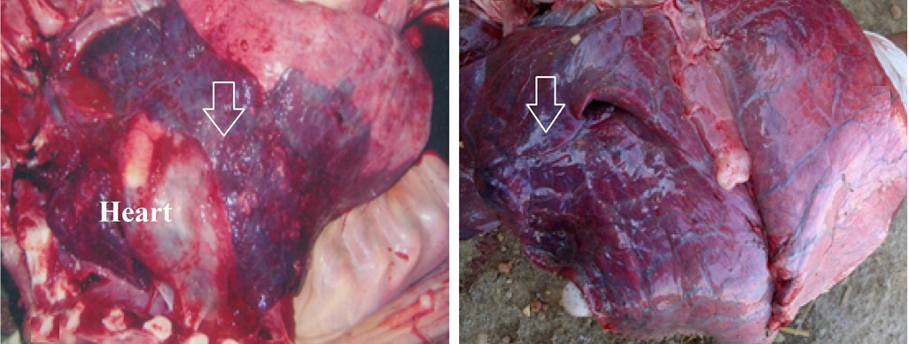 Necropsy finding of two calves with diffuse lung consolidation (arrow)