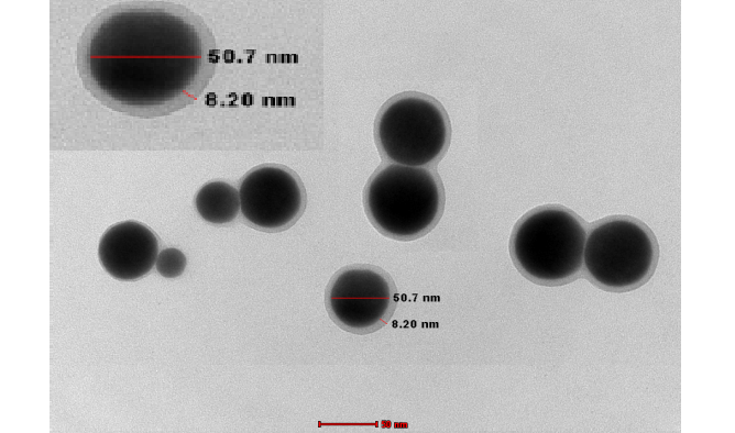 HR-TEM image of Nano Se-Met core shell with average size 60 nm for core and 8 nm for shell