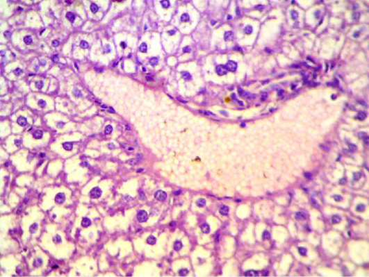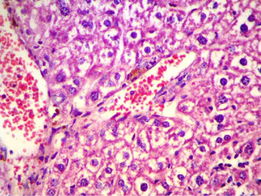 Liver section shows congestion with degeneration and depletion of glycoprotein granules (H&E 400 X)