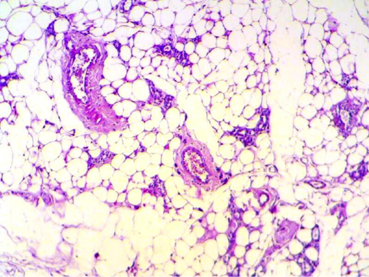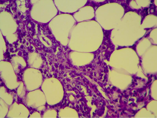 Mammary gland section shows inflammatory reaction around mammary alveoli with destruction of adipose tissue. (H&E 200 X)