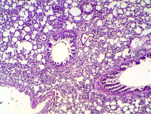 Lung section shows damage of alveoli septa and small bronchial epithelial (H&E 200 X)