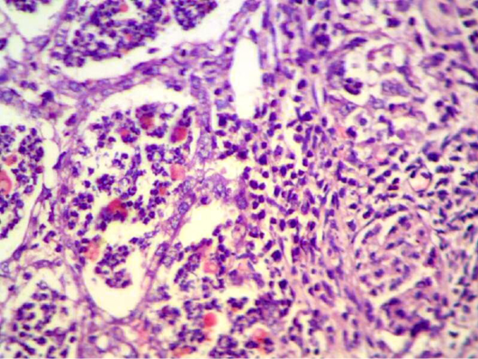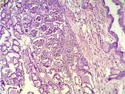 Mammary gland section shows sever destruction of mammary gland with abundant of inflammatory cells infiltration (H&E 200 X)