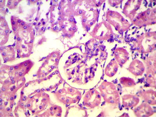 Kidney section shows degeneration, necrosis in renal tubules and inflammatory cell infiltration. (H&E 400 X)