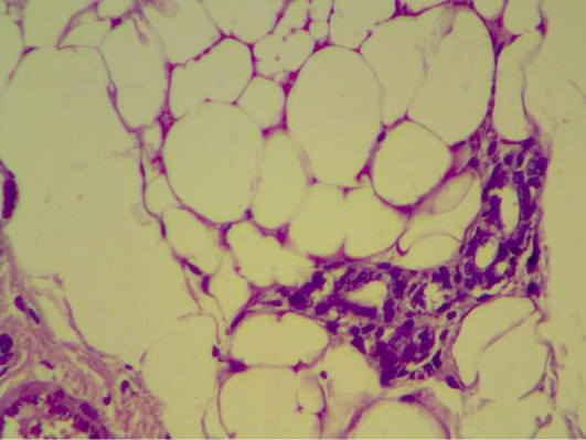 Mammary gland section shows mild inflammatory cell with normal looking adipose tissue. (H&E 200 X) (H&E 400 X)