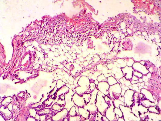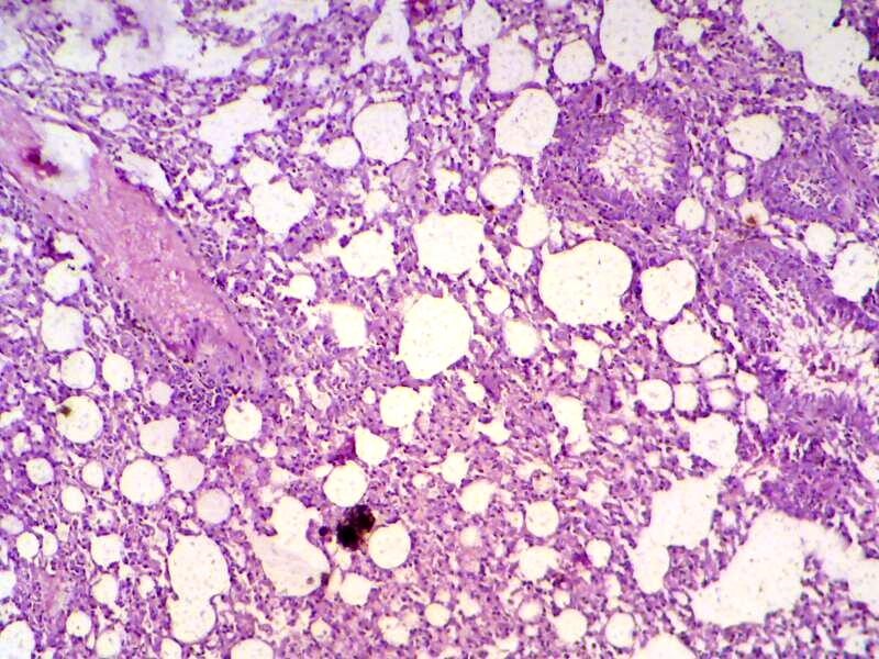 Mammary gland section shows sever inflammatory cell infiltration, haemorrhagic exudate (oedema) and destruction of adipose tissue and mammary alveoli (H&E 200 X)
