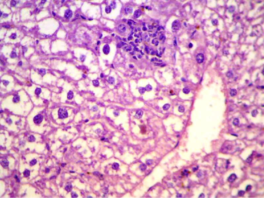 Liver section shows depletion of glycoprotein granules with degeneration and necrosis and inflammatory cell infiltration (H&E 400 X)