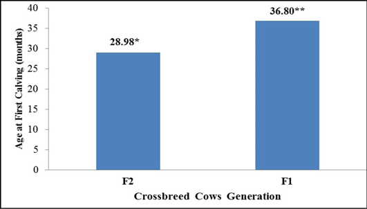 Age at first calving based on crossbreed generations in dairy cattle farms in the area of Bobo-Dioulasso (Burkina Faso). Label bars with the different number of asterisks (*) vary significantly (P< 0.05)