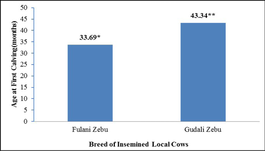Age at first calving of crossbreeds according to breed of local cows in dairy cattle farms in the area of Bobo-Dioulasso (Burkina Faso). Label bars with the different number of asterisks (*) vary significantly (P< 0.05)