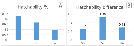 Effect of pre-warming on hatchability. A) Hatchability (%) of individual groups; B) Hatchability differences between various groups. A, pre-heated at 82°F for 5 hours; B, pre-heated at 82°F for 3 hours; C, without pre-heat treatment (control)