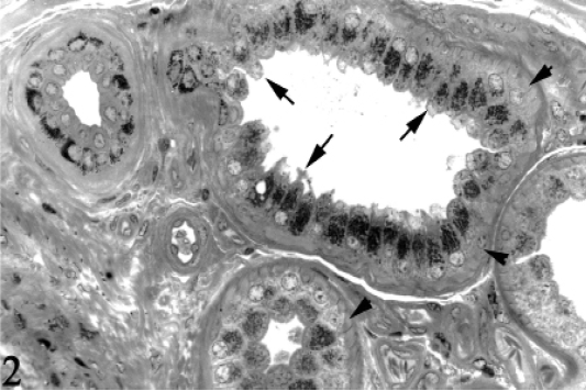 The secretory end-pieces of the epitrichial sweat glands at the thigh region of 6 years-old camel, showing numerous basophilic granules at the apical portion of the cells. Some cells bear a budding appearance (Cytoplasmic blebbing, arrows) apically. Myoepithelial cells (Arrowheads). Toluidine blue, X400.