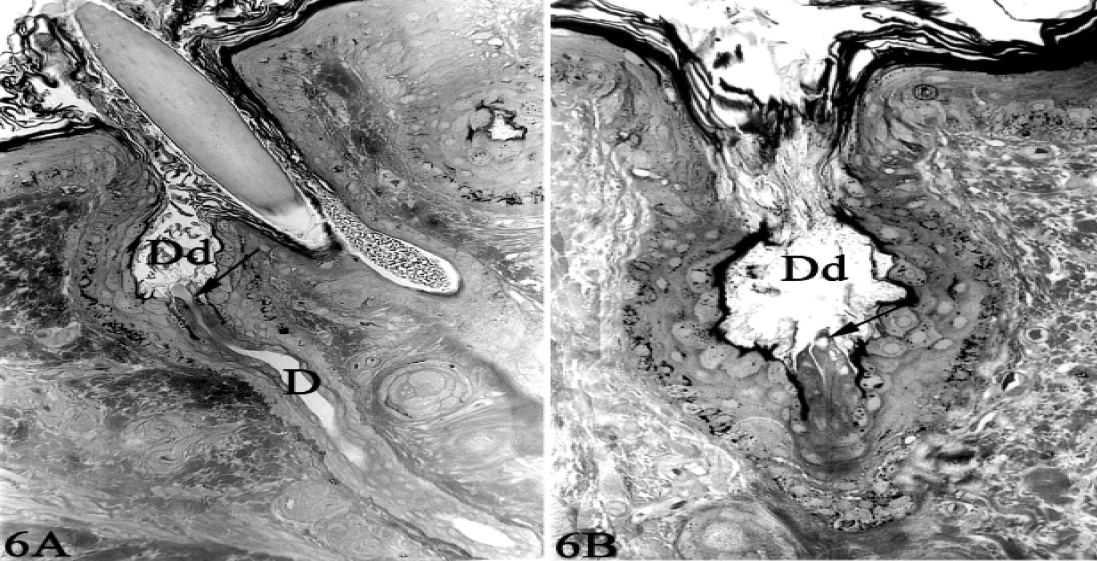 The terminal portion of the excretory duct (D) opening into an oval or rounded-shaped dilated destination device (Dd) at the outer most portion of a primary hair follicle (epitrichial sweat gland “A”) or emptying on to the skin surface in an interfollicular location (atrichial sweat gland “B”). Notice the terminal portion of excretory duct (arrow) projecting into the lumen of the dilated destination device. Toluidine blue, X250.
