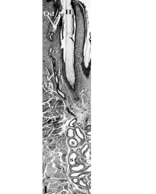 An epitrichial sweat gland at the thigh region of seven years-old camel , consisting of two portions: the secretory portion (S) and the excretory duct (D) opening into the primary hair follicle in the nearby of the epidermis. Dilated destination device (Dd), primary hair (H). H&E, X100.