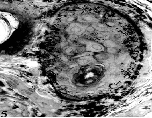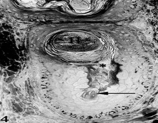 Cross section of the hair follicle at the level of the dilated destination device, at the thigh region, of six years-old camel, showing the nozzle-shaped terminal portion of the excretory duct (arrow) and the opening of this device into a neighbouring hair follicle (*). Notice the histomorphological differences between the epithelial lining of the hair follicle and that of the dilated device. Primary hair (H), Toluidine blue, X250.