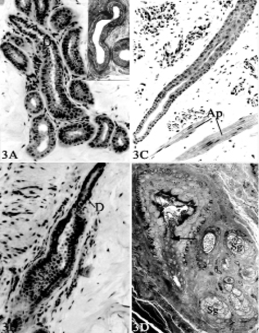 3A, The secretory portion of the epitrichial sweat gland at the belly region of 6 months-old camel, showing the commencement of the excretory duct (D), secretory portion (S). Toluidine blue, X160. Inset: The excretory duct at the thigh region of 6 years-old camel, showing a wavy pattern in their way to open into a primary hair follicle. Toluidine blue, X250. 3B, The transition between the secretory portion (S) and the excretory duct (D) at the neck region, of 3 years-old camel. Toluidine blue X160. 3C, The excretory duct of the epitrichial sweat gland at the shoulder region, towards its opening into the primary hair follicle (upwards), Ap= Arrector pili muscle. Toluidine blue, X160. 3D, The excretory duct (arrow), receiving a conical jacket of stratified epithelium, in its way to open into the apex of the destination device, sebaceous gland (Sg). Toluidine blue, X 250.