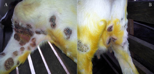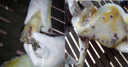 Photograph of a Boer goat with severe, proliferative and ulcerative Orf lesions in the skin of axillary region, upper right forelimb and thoracic region (A) proliferative scabby Orf lesions in the skin of upper right hind limb region and supper mammary region (B)