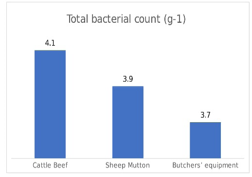 The mean bacterial population (bacterial load) in cattle beef, sheep mutton and butchers’ equipment samples retailed at Tando-Allahyar.
