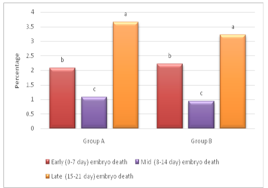 Dead in shell (DIS) analysis on weekly basis a-c denote difference in embryo death between early, mid and late stage of incubation (P< 0.05)