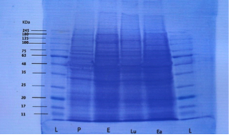 Destained gel showing protein band fractions during different phases (L=ladder, P=proestrus, E=estrus, Lu=luteal phase and Ea=early pregnancy