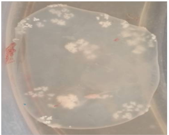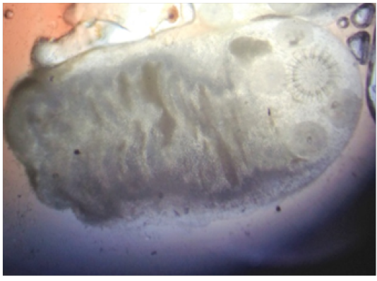 Microscopic view of Coenurus gaigeri showing a single scolex with hooks (10X)