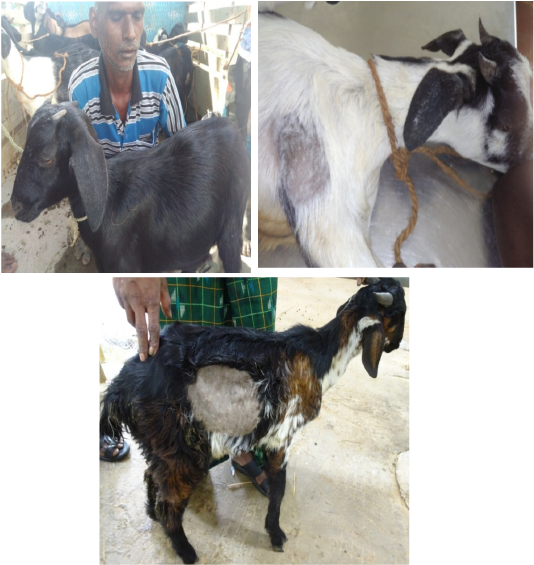 a) Cyst on the dorsal lumbar region; b) Cyst in the prescapular region; c) Cyst in the right flank region behind the last rib