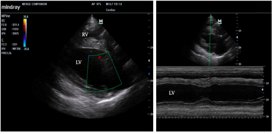 Echocardiographic of longitudinal image of heart (left) and M mode image of the left ventricle (right); RV = right ventricle, and LV=left ventricle.