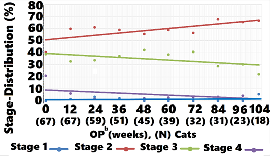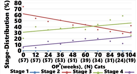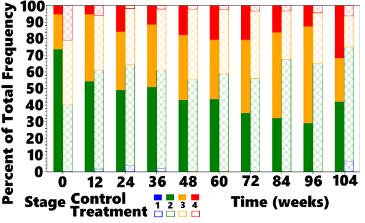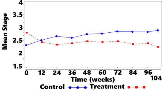 Cumulative IRISa Stage Frequencies in Treatment and Control Groups vs. Time