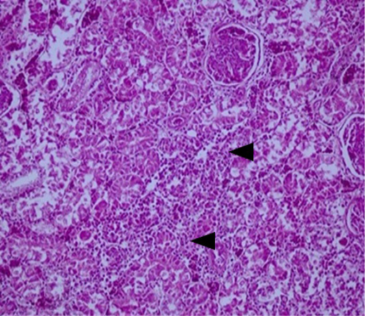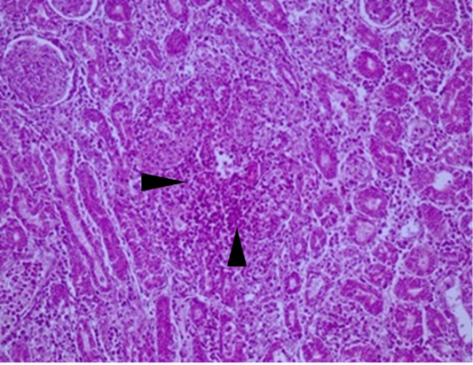 Kidney: necrotizing nephritis in a broiler suspected of salmonellosis (arrow) (HEX200)