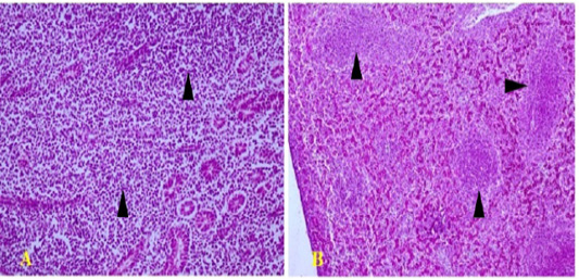 Polymorphic lympho-plasmocytic tumor infiltration in the kidney (arrows) (A; HEX200) and the liver (arrows) (B; HEX100)