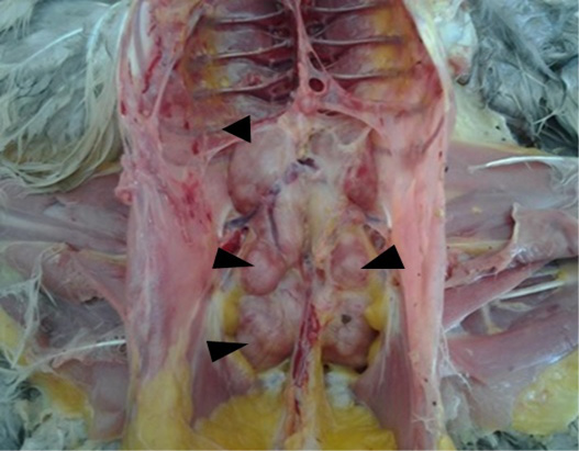 Renal tumor nodules (arrows) in a free-range pullet suspected of Marek’s disease