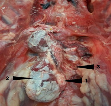 Visceral gout and urolithiasis (1) in a layer. Note hypertrophy (2) of the right kidney and the spectacular atrophy of the left kidney (3)